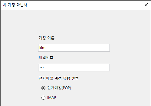 전자메일을 선택해서 새 계정을 위처럼 만들어주면 된다.