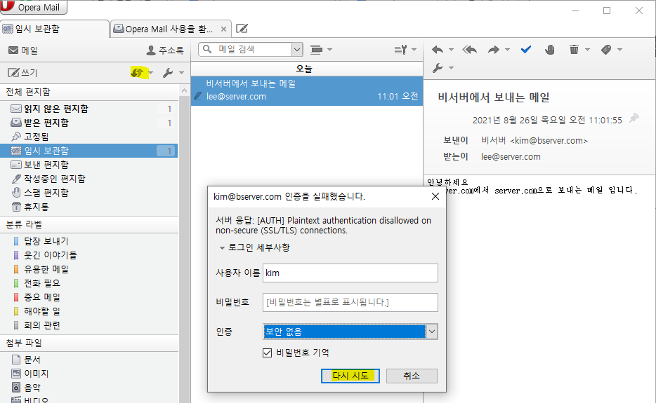 임시보관함에 메일이 있으면 로그인세부사항을 클릭해서 인증을 보안 없음으로 바꾸고 다시시도 버튼을 누르면 된다