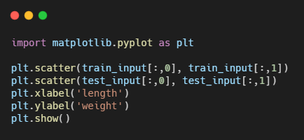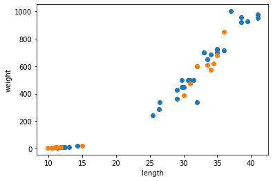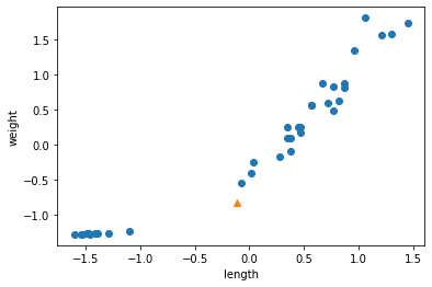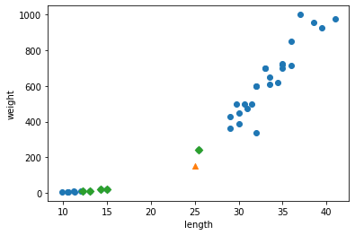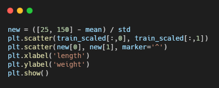 다시 산점도를 그려보니 세모 샘플에서 가장 가까운 샘플은 모두 도미로 예측했음을 확인할 수 있다.