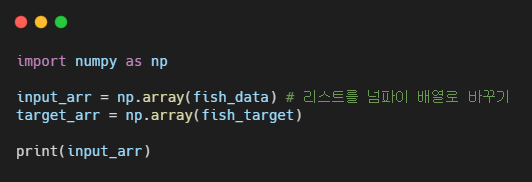 인덱스 배열의 처음 35개를 input_arr와 target_arr에 전달하여 랜덤하게 35개의 샘플을 훈련 세트로 만든다