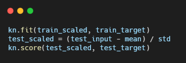 위에서 만든 훈련 세트와 테스트 세트로 k-최근접 이웃 모델을 훈련시켜 보자