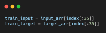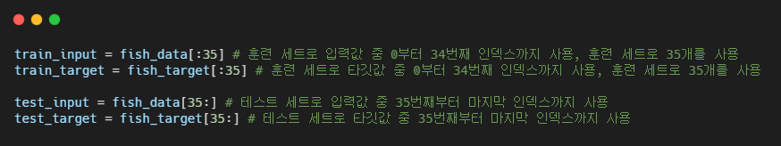 이러면 훈련세트로 입력값과 타깃값 중에 35개를 사용한다는 뜻이고 테스트 세트로 나머지를 사용한다는 의미인데 이것은 문제가 있다.