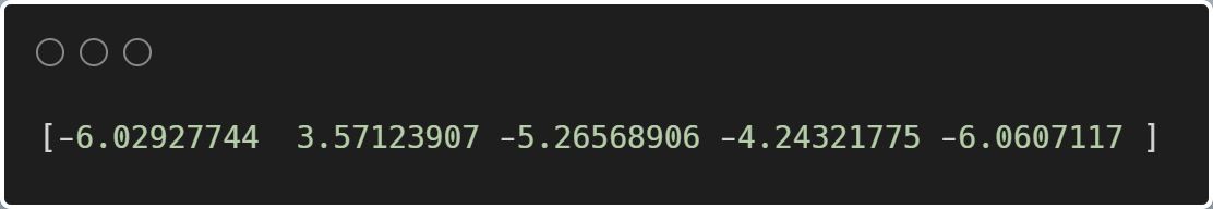 두 번째 샘플을 제외하고 모두 도미로 예측했다. KNeighborsClassifier와 마찬가지로 predict_proba() 메서드를 통해 train_bream_smelt에서 처음 5개 샘플의 예측 확률을 출력해보자