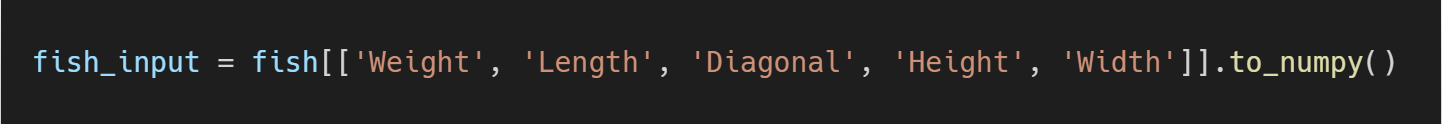 입력 데이터로 사용하기 위해 데이터프레임에서 원하는 열을 리스트로 나열해 선택한다. 여기에서는 5개의 열을 선택해서 to_numpy() 메서드로 넘파이 배열로 바꾸었다. 그리고 이것을 fish_input에 저장했다.