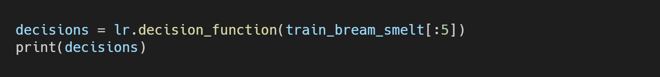 LogisticRegression 클래스의 decision_function() 메서드로 z값을 출력할 수 있다. train_bream_smelt의 처음 5개 샘플의 z값을 출력해보면