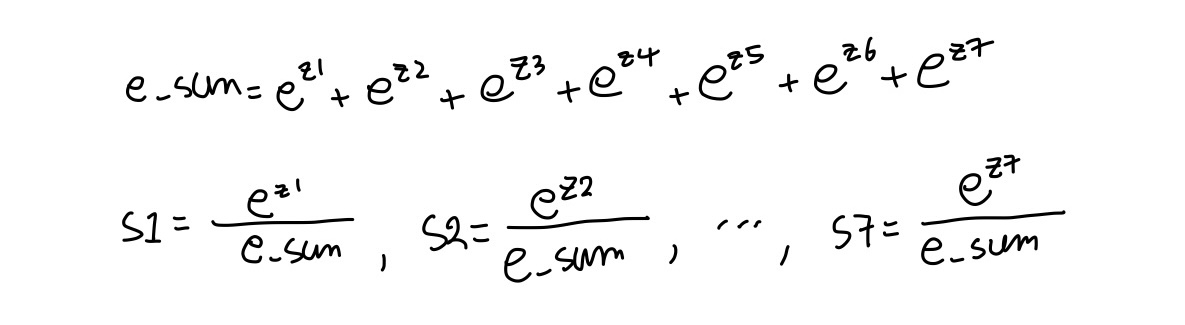 다중 분류는 소프트맥스(softmax) 함수를 사용하여 7개의 z값을 확률로 변환한다.