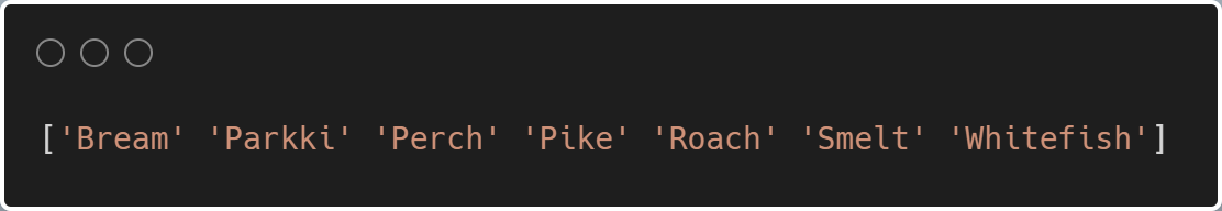 어떤 종류의 생선이 있는지 알아보기 위해 Species 열에서 고유한 값을 추출해보기 위해 pandas의 unique()함수를 사용한다.