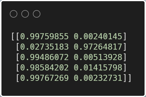 테스트세트에 있는 처음 5개의 샘플에 대한 확률을 출력해본다.