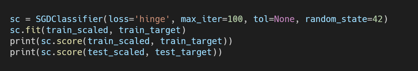SGDClassifier의 객체를 만들 때 매개변수를 2개 지정한다.