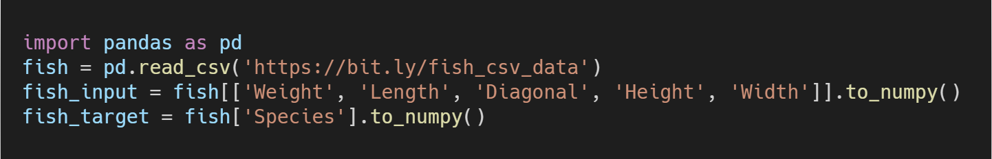 csv 파일에서 판다스 데이터 프레임을 만들고 'Species' 열은 타겟 데이터로, 이를 제외한 나머지 5개를 입력 데이터로 사용한다.