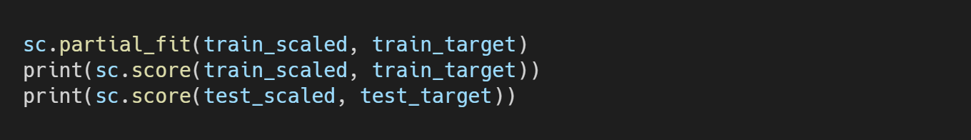 SGDClassifier 객체를 다시 만들지 않고 훈련한 모델에 추가로 더 훈련을 시킨다.