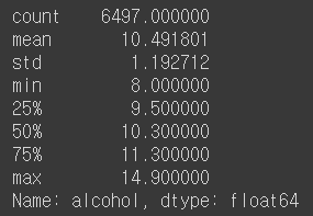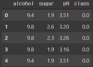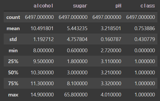 총 6497개의 샘플이 있고 4개의 열은 모두 실수값(float)임을 알 수 있다.