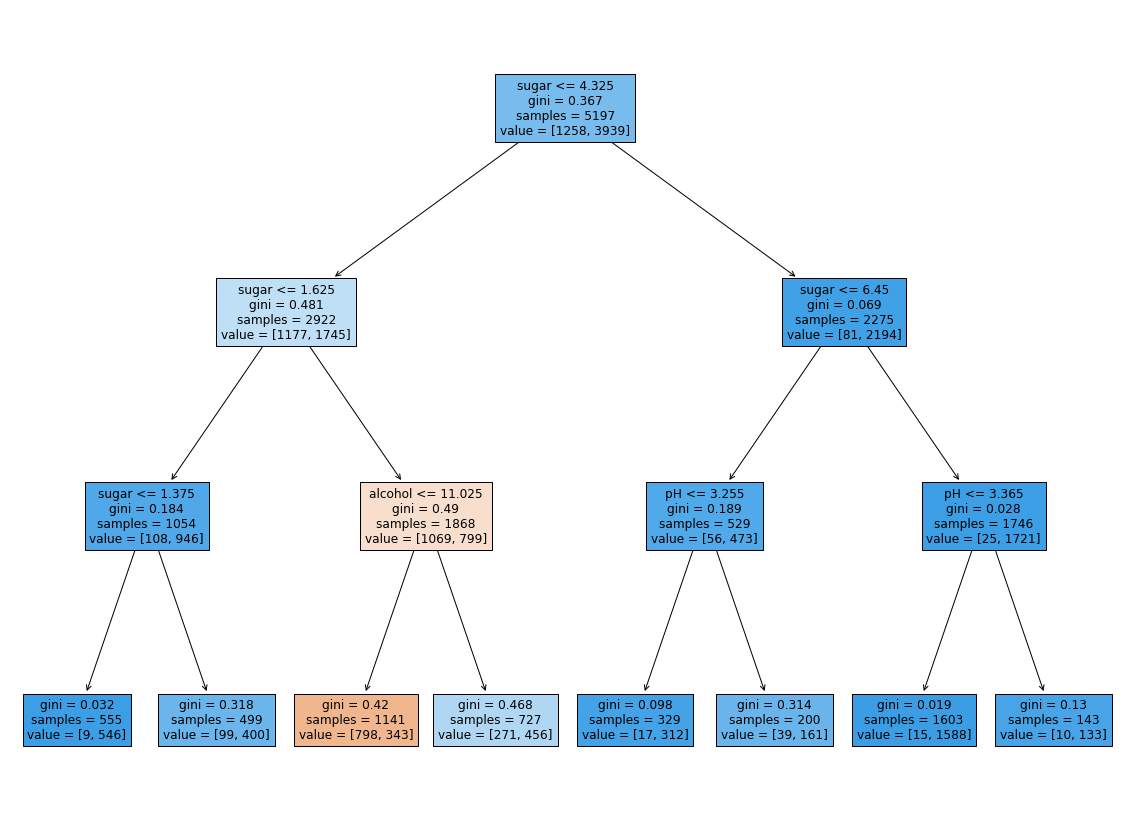 plot_tree(dt, filled=True, feature_names=['alcohol', 'sugar', 'pH'])