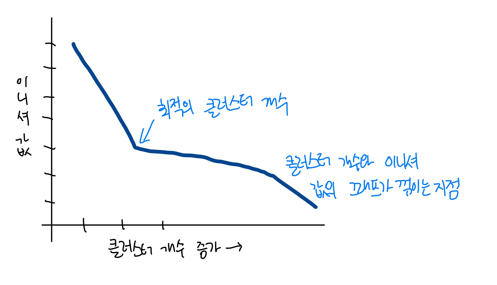 클러스터 개수를 증가시키면 이너셔가 감소하는 속도가 꺾이는 지점이 있는데 이 지점부터는 클러스터의 개수를 늘려도 클러스터에 잘 밀집된 정도가 크게 개선되지 않아 이너셔가 크게 줄어들지 않는다