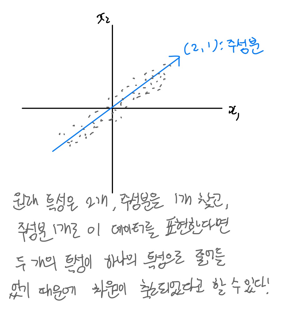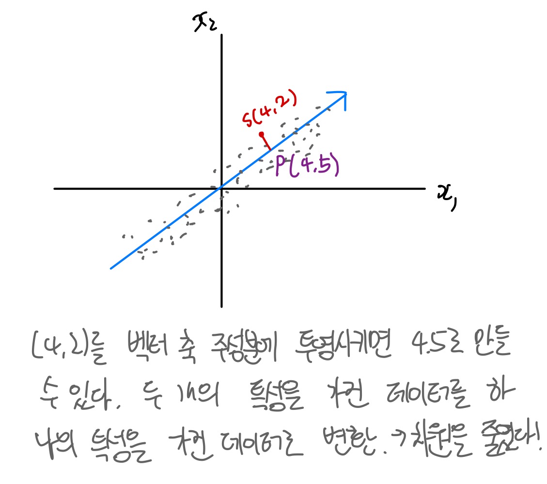 데이터를 가장 잘 나타내는 일부 특성을 선택해 데이터 크기를 줄이고 지도 학습 모델의 성능을 향상시키는 방법 또는 줄어든 차원에서 원본 차원으로 손실을 최대한 줄이면서 복원->특성의 개수를 줄인다
