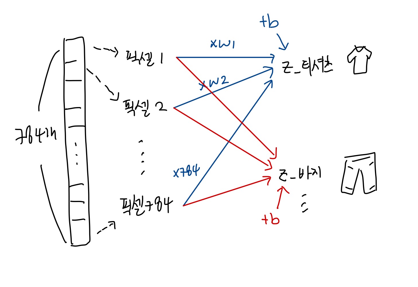 z_바지 = w1' x (픽셀1) + w2' x (픽셀2) + ... + w784' x (픽셀784) + b'