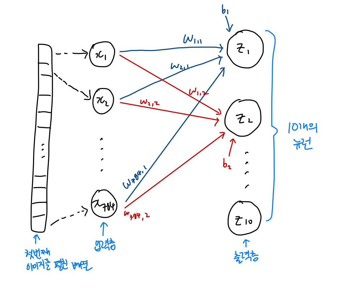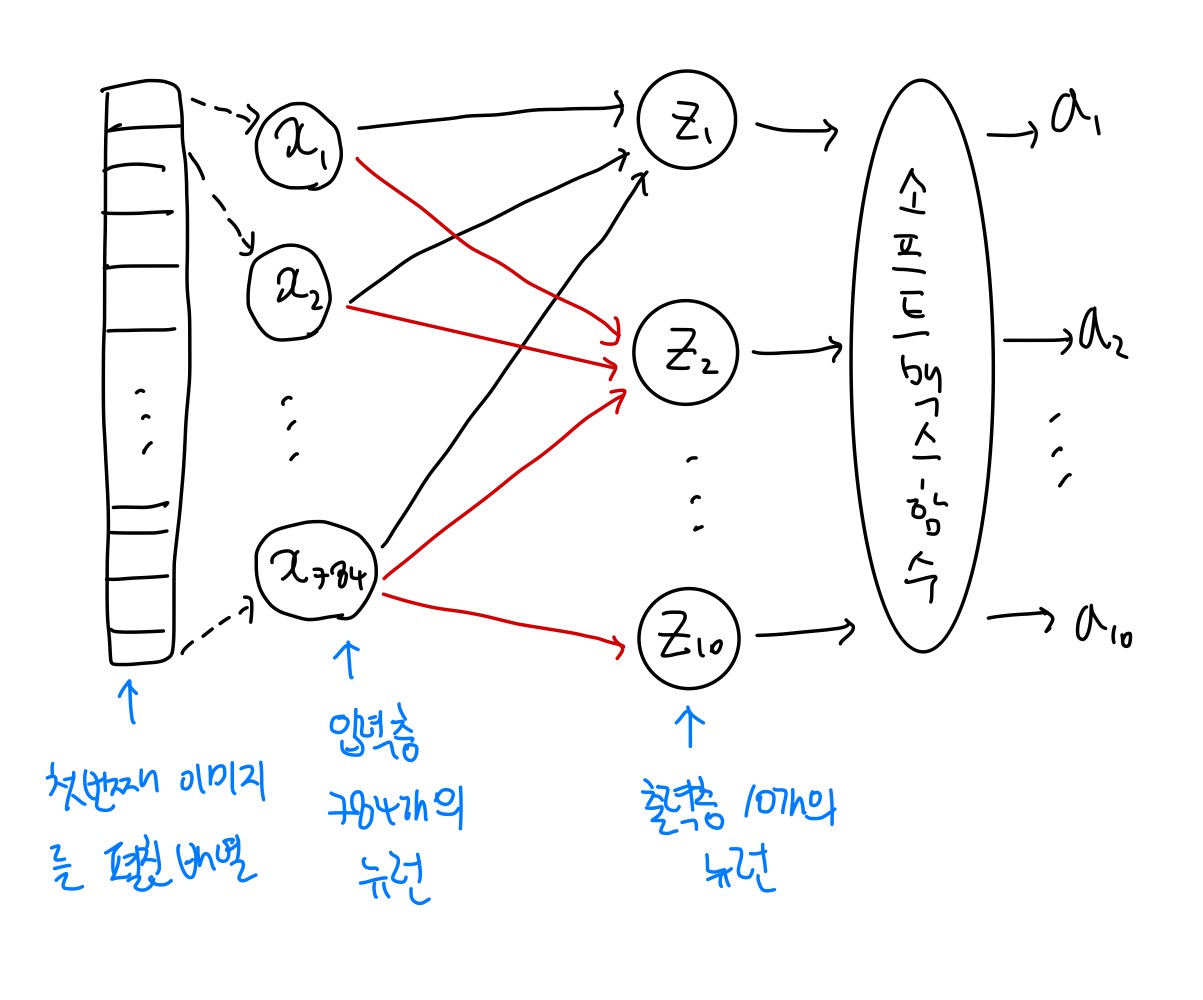 - 784개의 픽셀과 10개의 뉴런이 모두 연결되면 784 x 10 = 7840개의 연결된 선들이 빽빽하게 나타나게 된다.