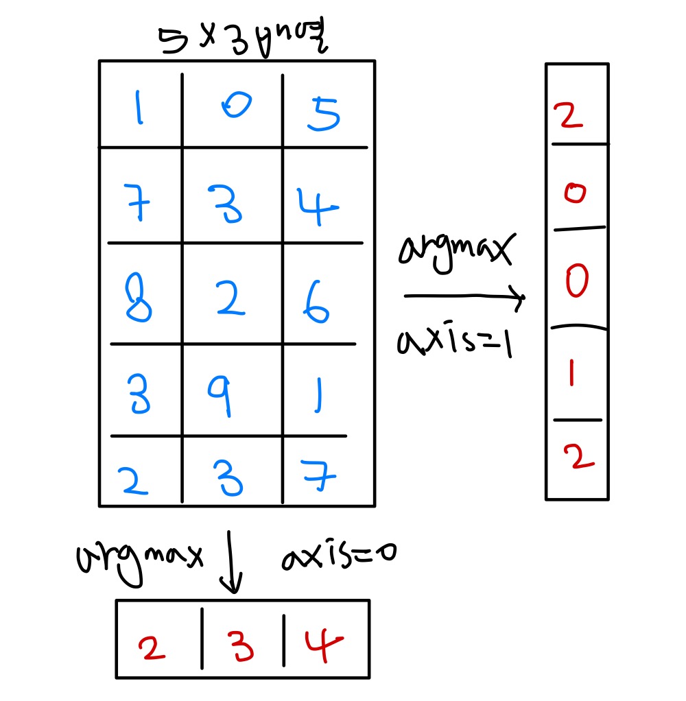 axis = 1이면 열을 따라 각 행의 최댓값의 인덱스를 선택하고, axis = 0이면 행을 따라 각 열의 최댓값의 인덱스를 선택한다
