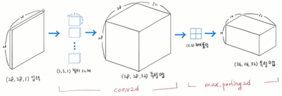 특성 맵의 가로세로 크기가 첫 번째 풀링 층(max_pooling2d)에서 절반인 14로 줄어들고, 두번째 풀링층(max_pooling2d_1)에서 절반인 7로 줄어든다