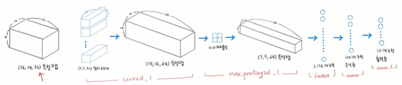 첫번째 합성곱 층(conv2d)를 통과하면 특성 맵의 깊이는 32가 된다. 두번째 합성곱 층(conv2d_1)에서는 특성 맵의 크기가 64로 늘어난다